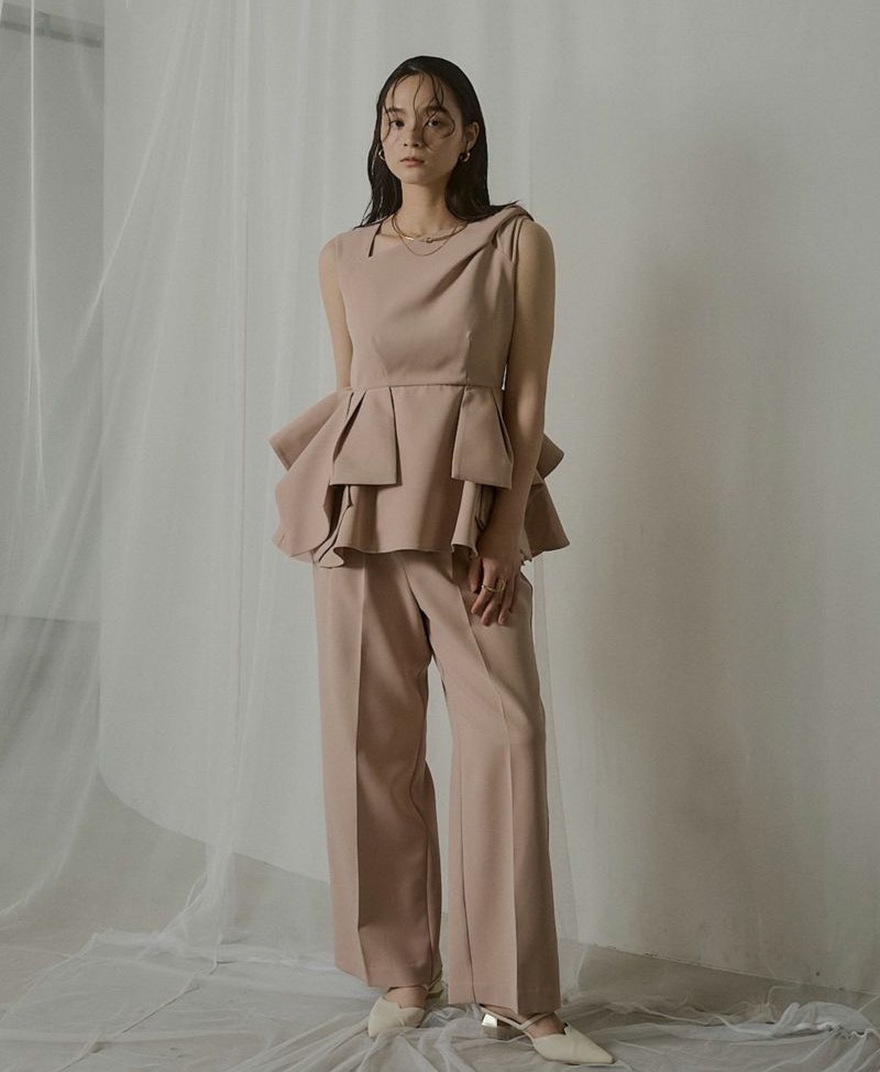 メリハリのある立体的なペプラムがインパクトのある都会的モードなセットアップパンツ。