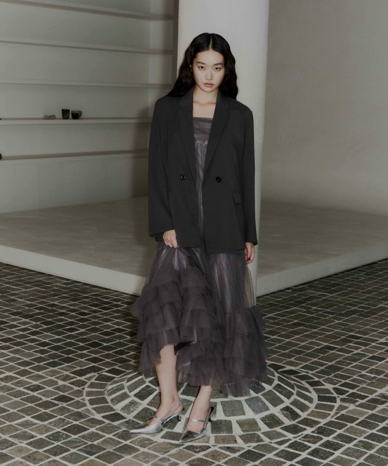 透け感のあるチュールワンピースが主役級の存在感を放つワンピースとジャケットを組み合わせたセットアイテム。