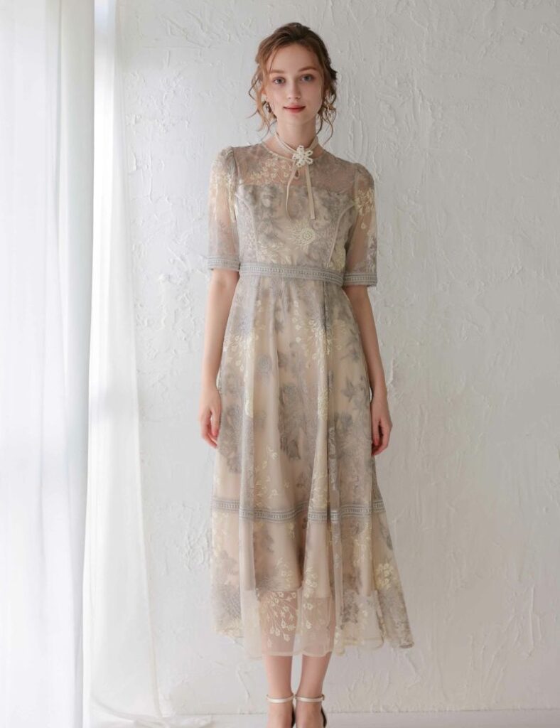 フラワーレース襟付きパフスリーブコクーンワンピースドレス