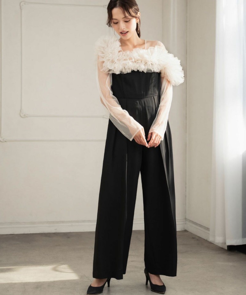 特徴的なギャザーチュールのオフショルダーにオールインワンがトレンドライクなエレガントなパンツドレス。