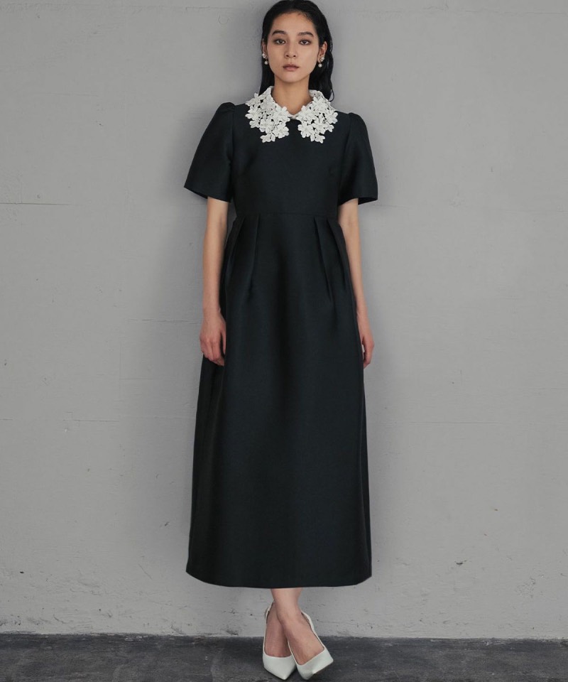 上品な雰囲気を演出するレースカラーコクーンドレス。花柄レースとパール使いの襟は簡単に取り外し可能な2WAYタイプ。