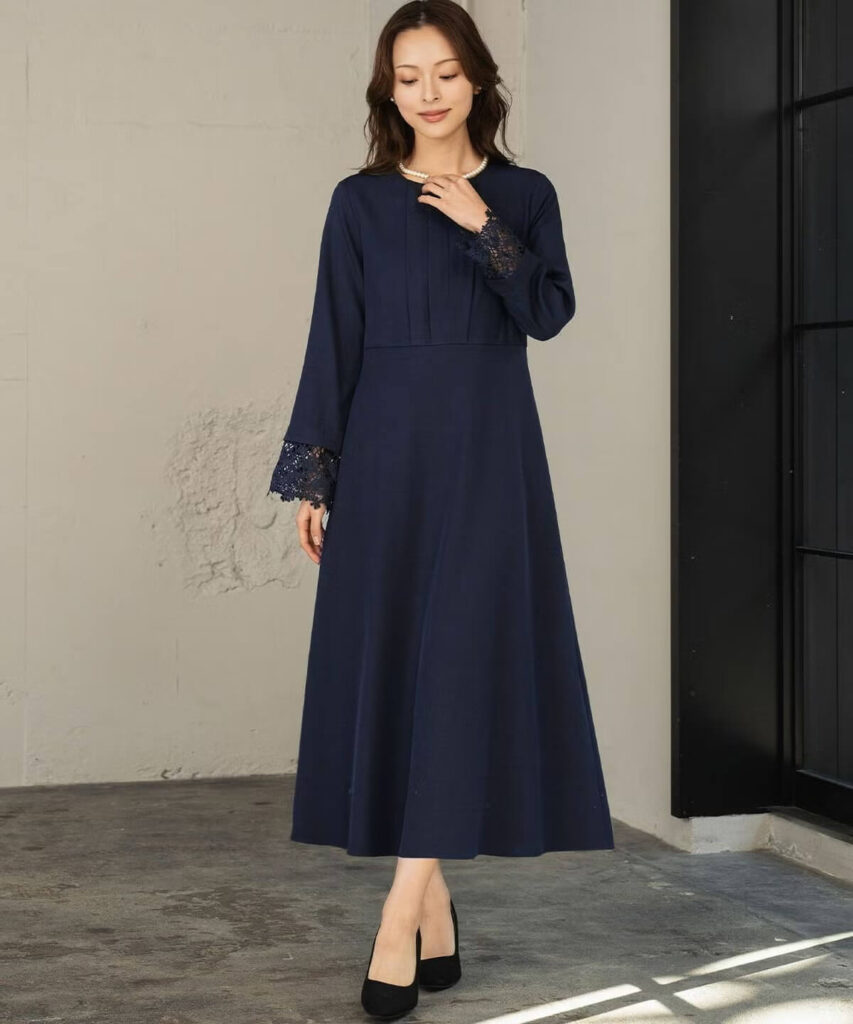 足元はストッキングを着用し5cm程度のヒールパンプスを合わせると全体のバランスが美しく仕上がります。