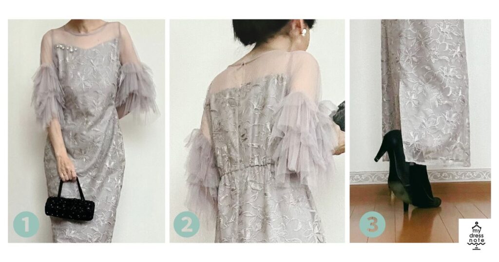 Pearl motif embroidery dressは「Iライン」で体型を拾い過ぎず、デコルテ部分を綺麗に見せるデザイン設計なので悩みも解消されお気に入りの1着となりました!