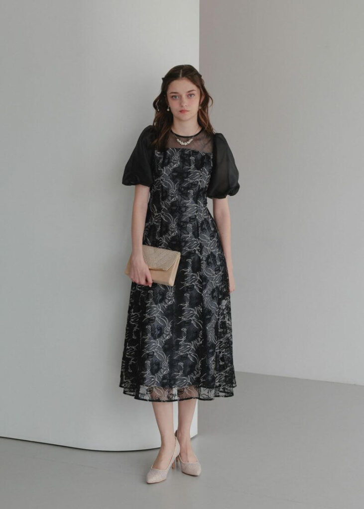 フラワーモチーフ刺繍生地にコードパイピングでメリハリを付けた着映えドレス。