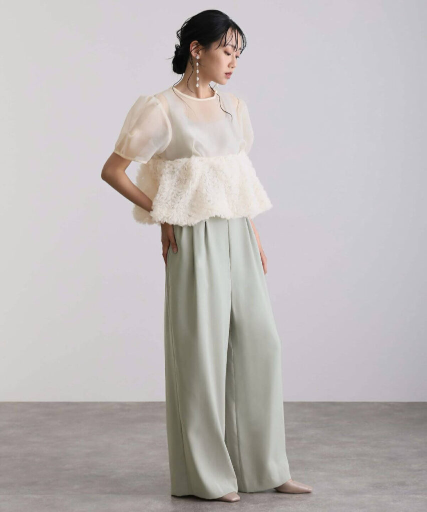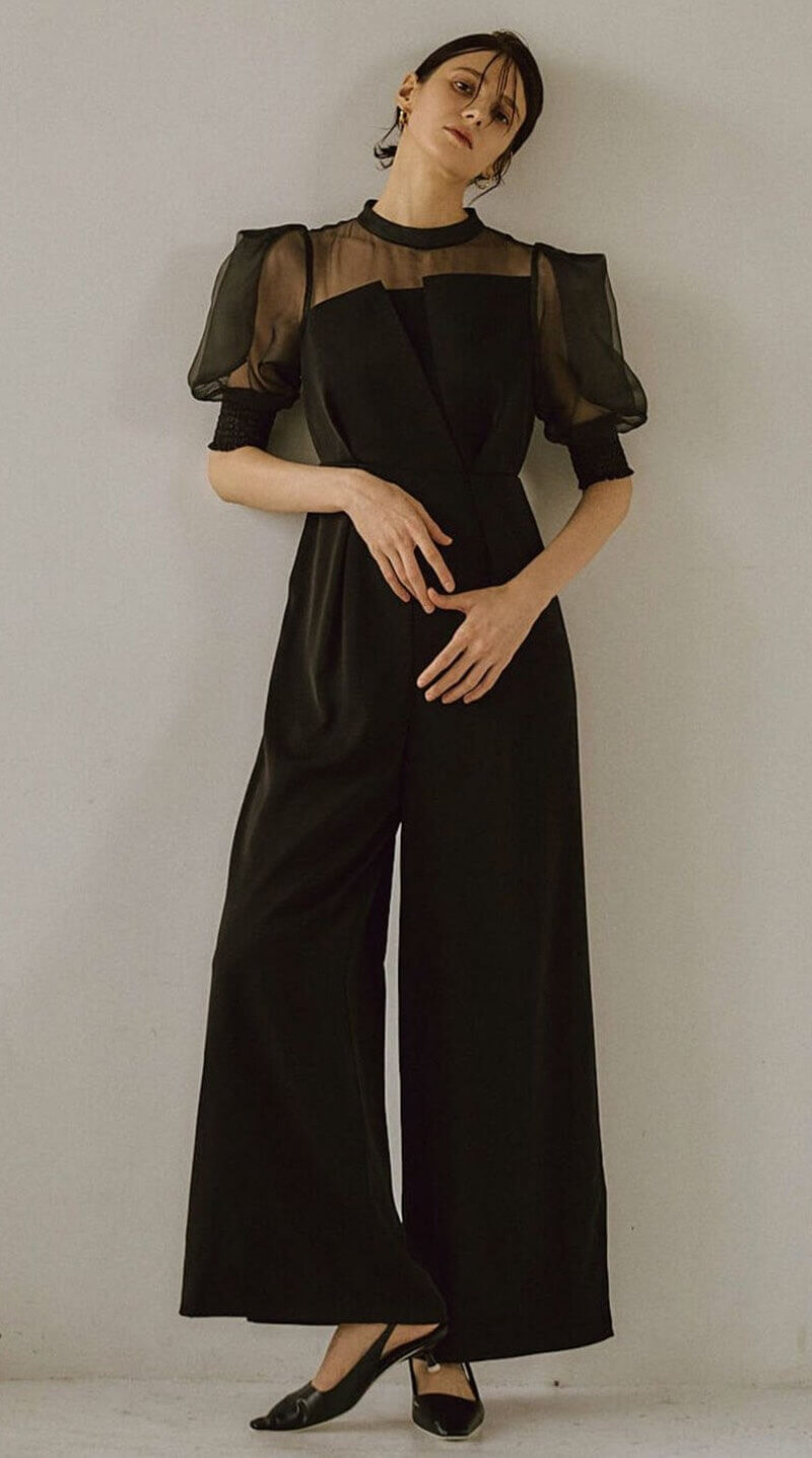 シアーブラウスとオールインワンのセットアイテム。上品なシアー感のブラウスがオケージョンシーンにぴったりです。