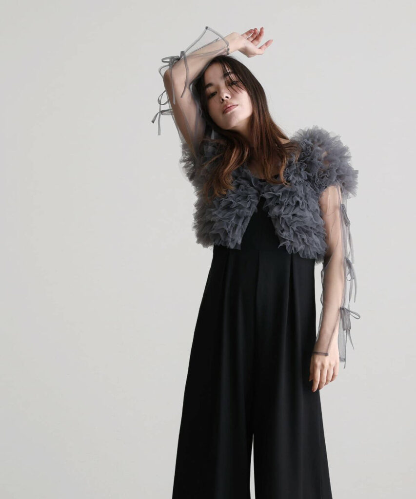 トップスは、チュールを2枚重ねることで袖とデコルテ部分は程よい透け感が出ています。セットで着用してオケージョンに、単品使いでカジュアルに、どちらのシーンでも活躍してくれます。