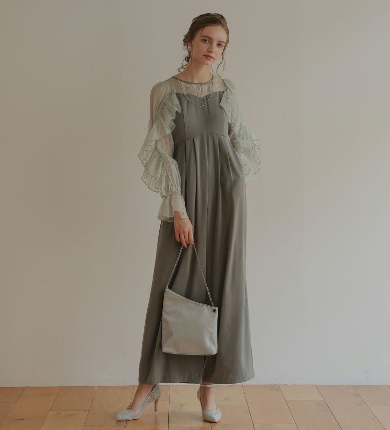 そでのボックススリーブのデザインは、オーガンジー素材なので強くなりすぎず、全体的に甘くなり過ぎずこなれた雰囲気に。都会的モードなコンビネゾンドレスです。